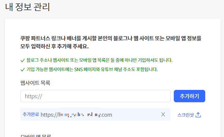 아래와 같이 이전에 등록했던 웹사이트 목록과,