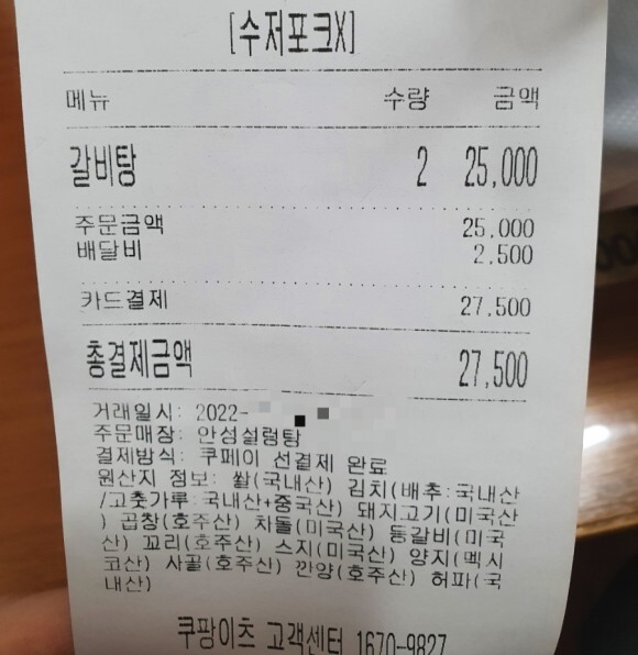 쿠팡이츠에서 주문한 영수증